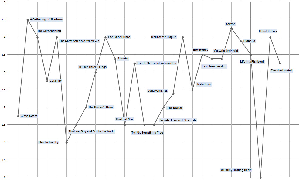 You have a chart? Impressive. I always think I should keep more detailed track of my books, but I’m too lazy. I rather hate Shusterman for the mental images he gave me with Unwind, and don’t want to pick up anything else by him… My TTT