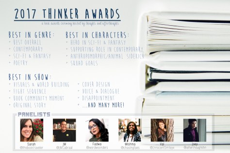Welcome to this year’s installment of the Thinker Awards, a yearly book awards ceremony hosted here on my blog showcasing the best of the best in fiction experienced during 2017. The esteemed panelists joining me in this year’s celebration are contributors and friends of mine from the YA community –