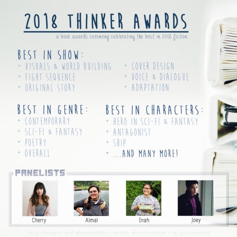 Hello, friends! Welcome to this year’s installment of the Thinker Awards, a yearly book awards ceremony hosted here on my blog celebrating the best in fiction experienced during 2018. Joining me in this year’s shindig are fellow buds of mine from the YA community –